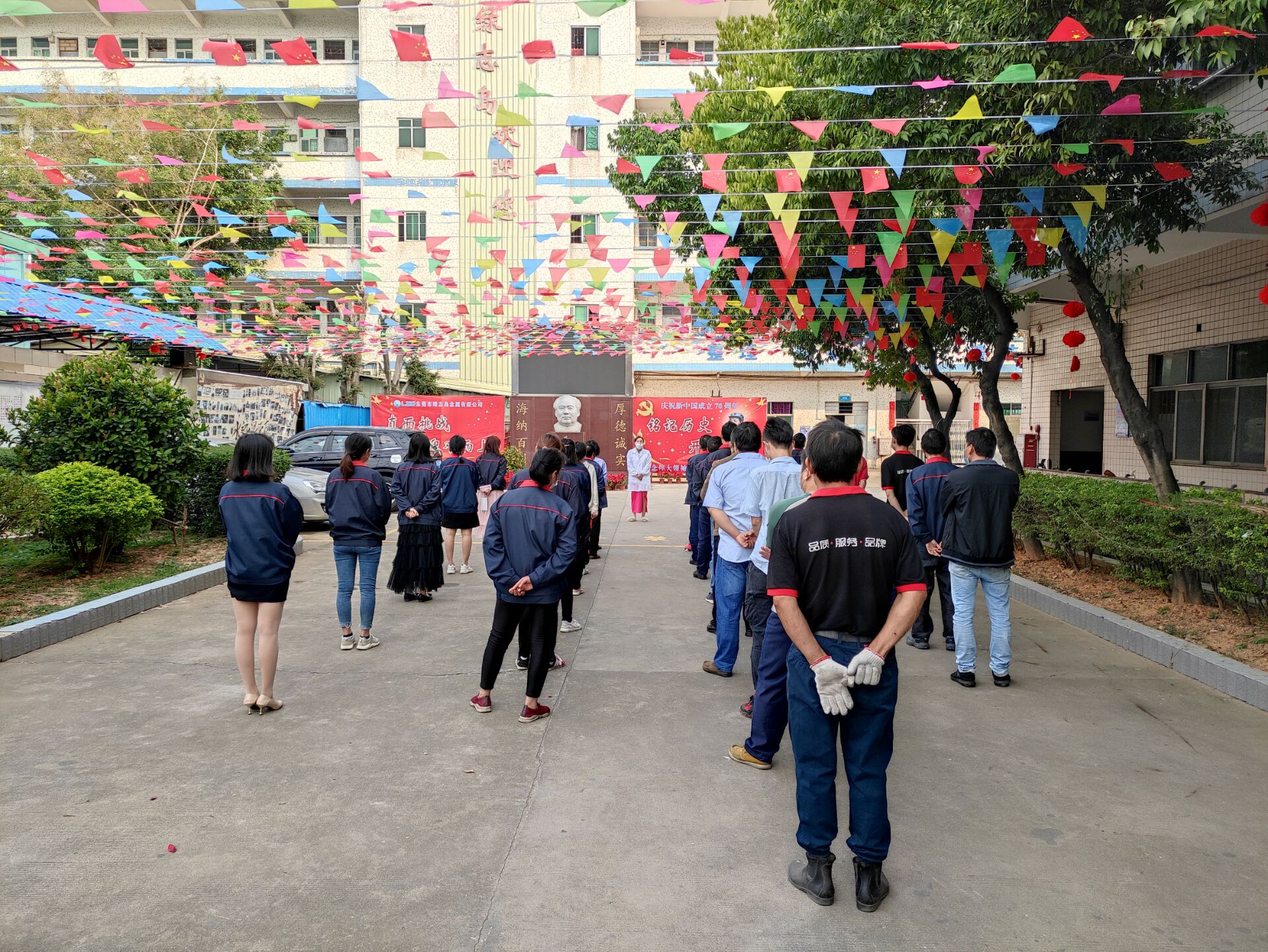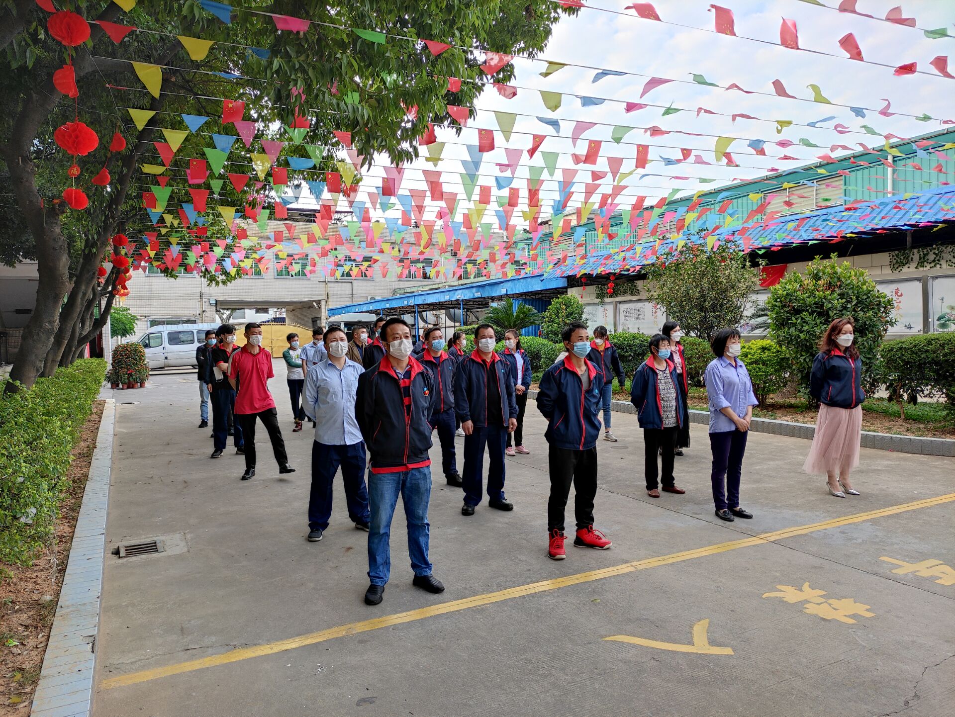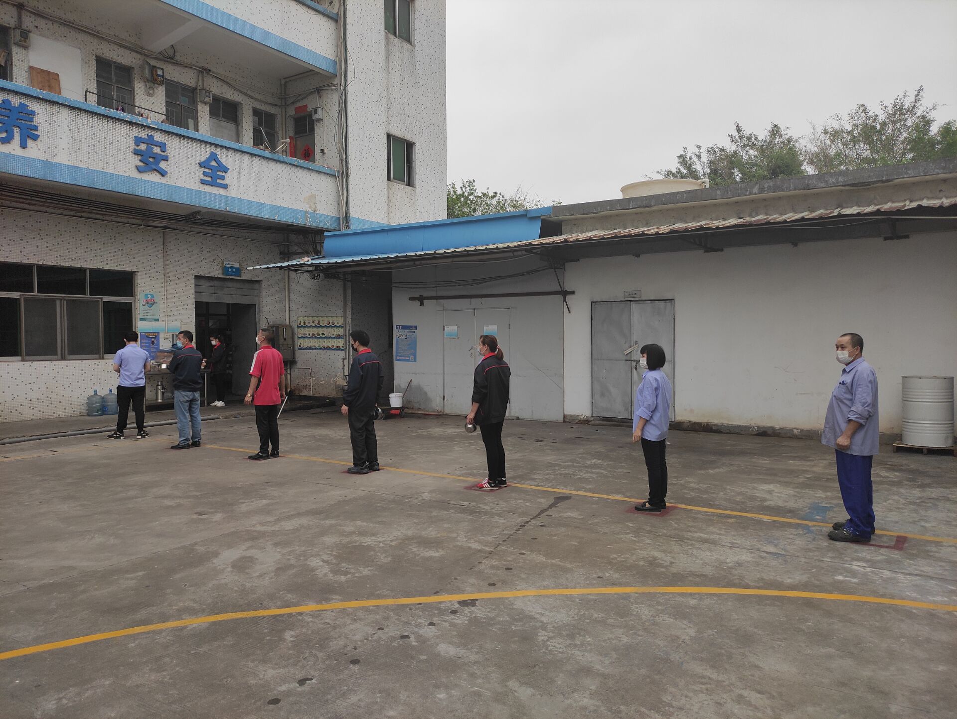 ▲周一早會盧經(jīng)理在室外給上崗人員宣導防疫知識